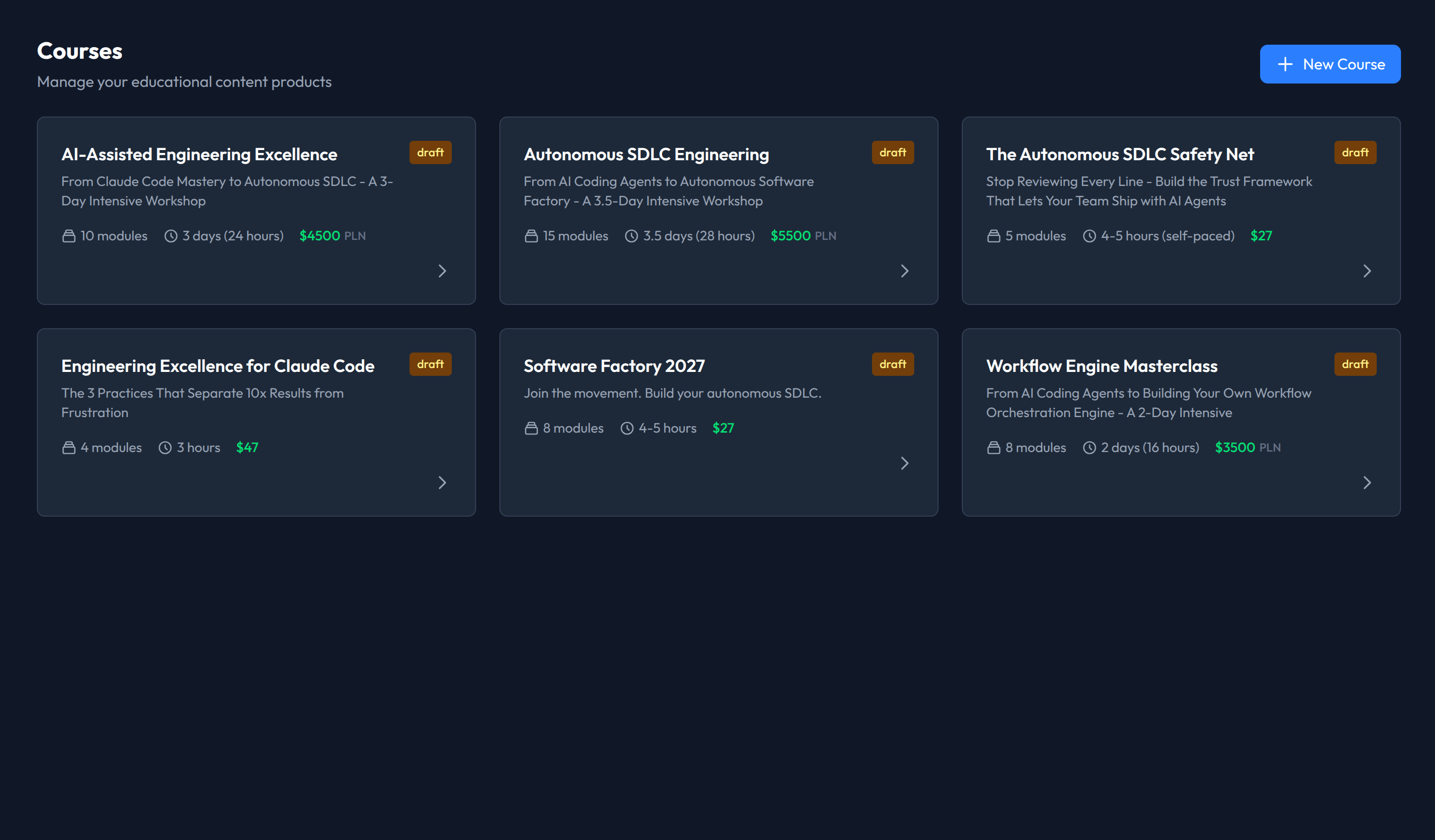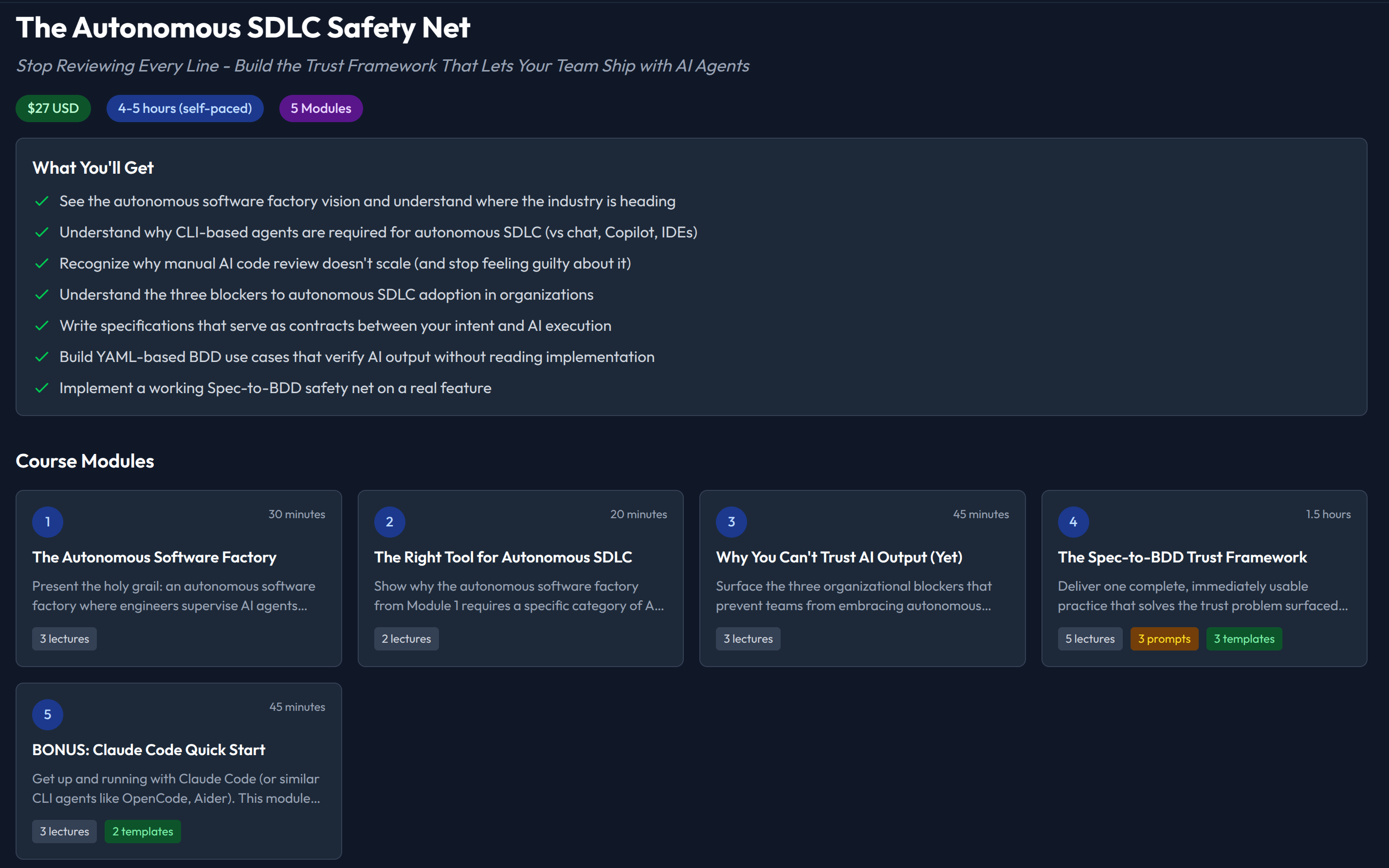 Deep-dive courses on Spec Driven Development, Trunk Based Development, Hexagonal Architecture, and DDD — the practices that make AI output match your standards.